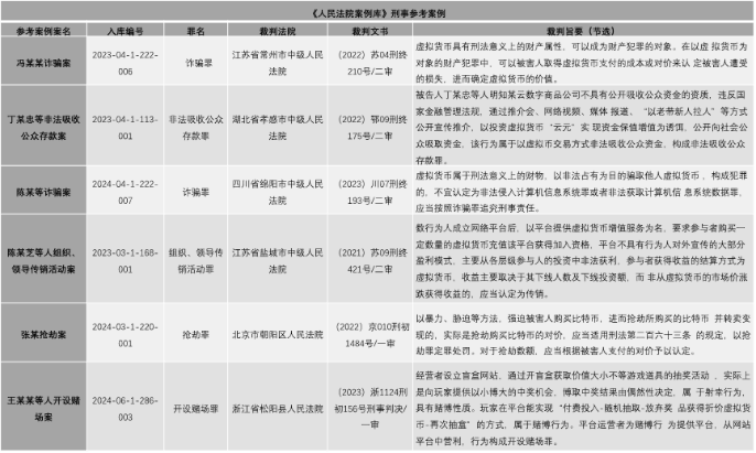笔者认为,尽管虚拟货币的法律属性未有定论,但不能否认其具有财物属性。理论依据上:一方面,虚拟货币应属于虚拟商品。基于马克思基本原理,“商品”是具有一定经济价值的财物。虚拟货币的技术基础可认定为数据,但其具有明显的财产特征,应被评价为刑法上“财物”。只在极个别情形下才认定为计算机数据或者系统的犯罪行为,如纯粹为猎奇或者展示计算机技术而侵入、篡改虚拟货币钱包信息数据等;另一方面,基于虚拟货币在刑事犯罪活动中的角色,其作为犯罪对象或工具,几乎都是因为其财物的性质。因此,虚拟货币法律属性的认定应以财物为原则,以计算机数据为例外,不仅可以更好的衔接审理和执行中对虚拟货币认定的连贯性、一致性,更能通过解决好财物和数据的定性方便司法处置中区分处置方式,维护好当事人的合法权益。司法实践中,最高人民法院于2024年初主持建设人民法院案例库,编发对类案办理具有参考示范价值的权威案例,为司法实务提供更加权威、规范、全面的指引。我国虽不是判例法国家,但人民法院案例库可以展现出最高审判机关权威意见。笔者通过关键词“虚拟货币”,共检索出十五个案例,其中十一个刑事案例,涉及“虚拟货币”法律属性的六例。入库案例普遍认为虚拟货币具有刑法上的财产属性,可以成为财产犯罪的对象。
