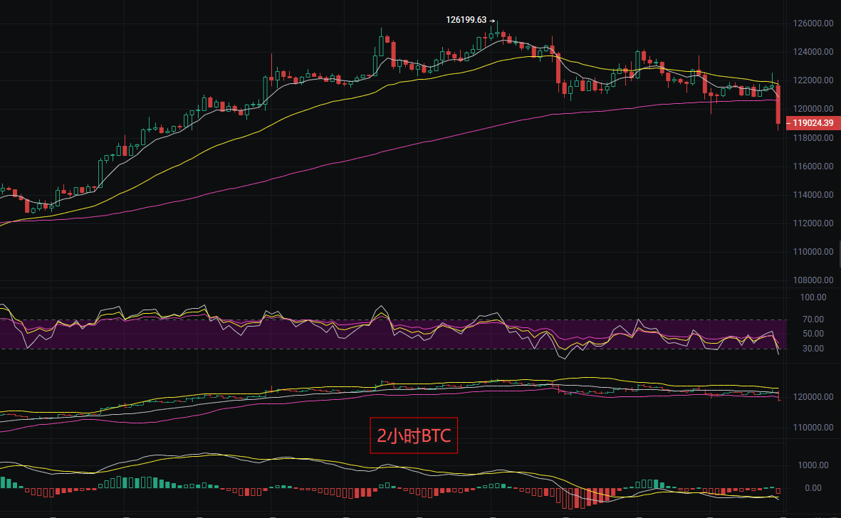 比特币现价119000,丽盈判断大饼技术面和外部环境均未提供明确的单边趋势信号。技术面显示市场处于下跌趋势,均线空头排列与死亡交叉形成强烈看跌信号,价格位于短期和长期均线之下。然而,成交量极度缩量且量价背离,表明下行动能可能不足,日线连续两日收阴且跌破前期支撑位121000弱势下行趋势,2小时高点逐步降低短期反弹乏力震荡偏空格局。MACD2小时空头力量占优;日线级别MACD也出现死叉迹象。EMA2小时EMA7与EMA30向下发散,价格多次受制于EMA7压制;日线确认空头趋势,丽盈思路空不变继续持有