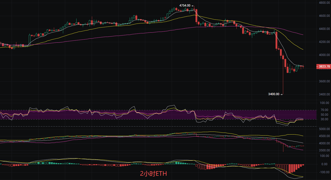 发稿前以太坊现价3825,丽盈观察目前盘口以太坊整体呈现下跌趋势。近期形成的黄昏之星形态与均线空头排列共同确认了看跌共振,进一步强化了下行趋势的概率。同时,成交量极度萎缩表明市场情绪较弱,价格下跌缺乏成交量的确认,需警惕潜在的加速下行风险。日线暴跌后形成小幅震荡整理的阴线小时K线连续下跌后的低位盘整形态,MACD日线小时空头动能减弱。EMA明显下行趋势偏空,所以思路上依旧是以空为主