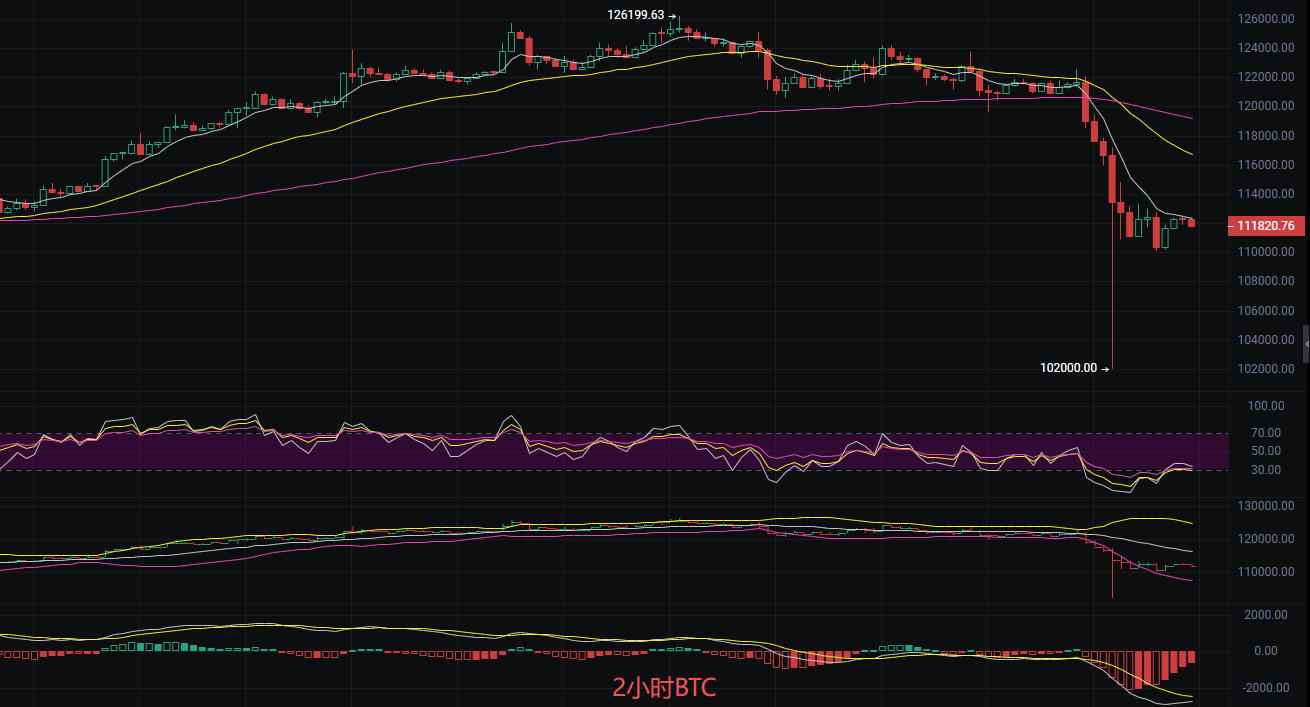 比特币现价111800,丽盈判断大饼当前下跌趋势,技术面信号显示空头占据主导地位。K线形态的黄昏之星以及均线系统的空头排列,均表明市场动能偏向下行。然而,成交量的极度缩量为这一趋势带来一定的不确定性,可能削弱下跌动能或引发短期反弹。此外,价格已接近关键支撑位102000,该位置的失守可能进一步加剧下行压力。日线连续下跌形成大阴线附近多次受阻后回落MACD2小时空头动能占优,EMA各均线呈现空头排列,由此可见空头趋势延续还没有,所以丽盈的思路不变依旧是跟随趋势顺势空为主