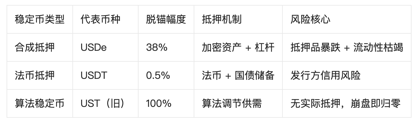 同样面对暴跌,USDe 与主流稳定币的表现天差地别,直接暴露合成稳定币的先天缺陷: