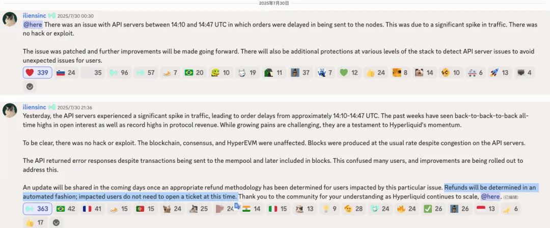 Hyperliquid 与社区连接紧密,响应迅速。例如在 2025 年 7 月一次 API 故障导致短暂宕机后,团队迅速补偿用户约 200 万美元损失,展现出 “快速响应、承担责任” 的作风。用户感受很好,社区一片好评。