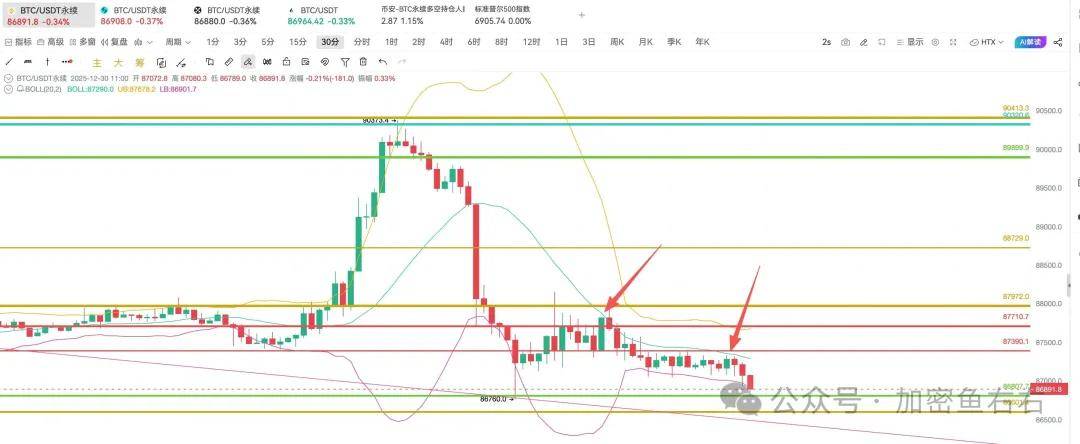 昨日BTC再次画门,BTC早上收长上影线实体阴线,与昨天形成阴包阳看跌结构,今日收盘并未能有效站上89600一带,再次陷入震荡盘整。