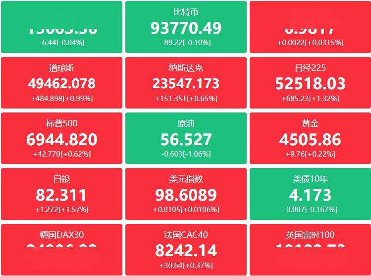 6、美股三大指数集体收涨,道指涨0.99%,纳指涨0.65%,标普500指数涨0.62%。其中,道指、标普500指数均创历史收盘新高;中概股涨跌不一,纳斯达克中国金龙指数跌0.78%。禾赛涨超10%,小马智行涨逾5%,华住、联电涨逾4%,BOSS直聘跌超6%,腾讯音乐跌逾4%,阿里巴巴跌超3%。