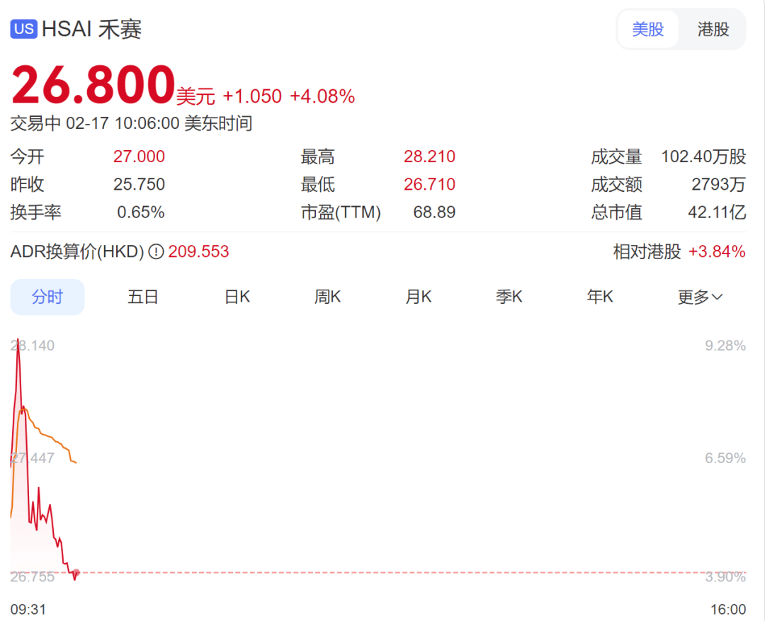 禾赛美股盘初涨超7%。截至发稿涨4.08%。马年春晚宇树两款人形机器人全部搭载了禾赛JT128激光雷达。