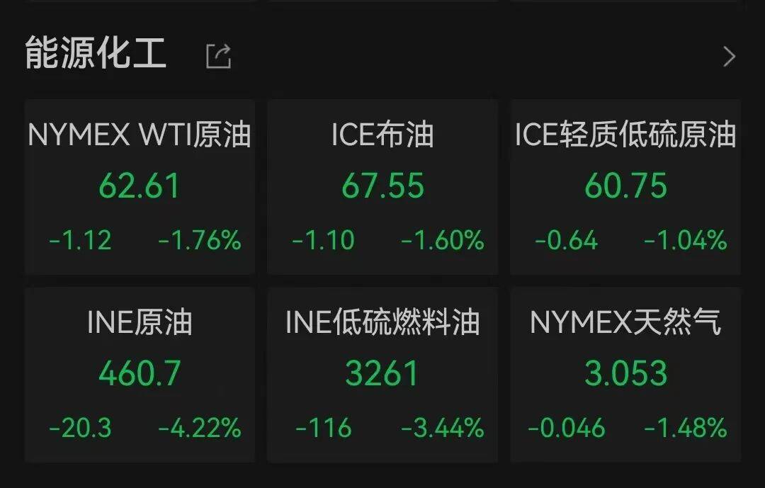 油价方面,WTI原油跌1.76%,报62.61美元/桶;布伦特原油跌1.6%,报67.55美元/桶。