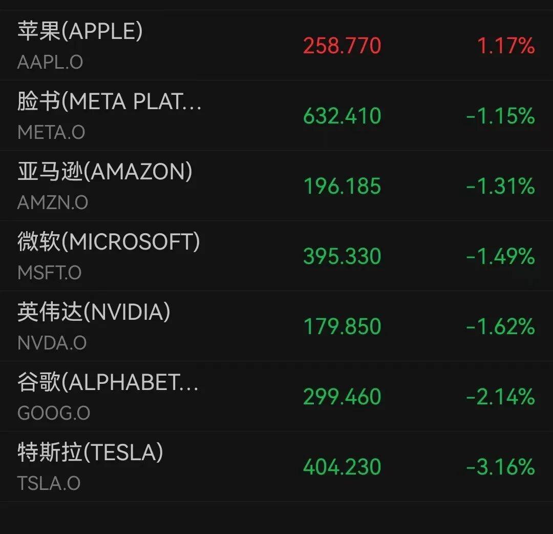 大型科技股普遍低开,特斯拉跌超3%,谷歌跌超2%,微软、英伟达跌超1.4%,苹果上涨1.17%,亚马逊下跌1.31%。截至上个交易日,今年以来科技七巨头全线下跌,科技七巨头指数年内累计下跌7.2%。
