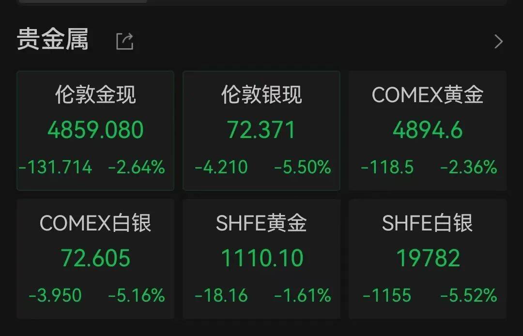 贵金属方面,黄金、白银齐跌。现货黄金一度跌破4850美元,现货白银也曾失守72美元,为2月6日以来新低。截至发稿,现货黄金跌2.64%,现货白银跌5.5%。