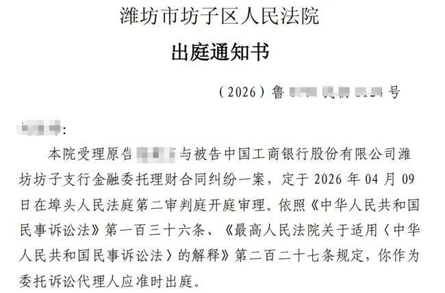 目前,许文华起诉工商银行的案件已经立案。据许文华提供的出庭通知书等文件,今年3月6日,潍坊市坊子区人民法院受理许文华与被告工商银行潍坊坊子支行金融委托理财合同纠纷一案,定于2026年4月9日开庭审理。