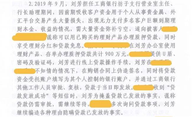 判决书显示:2019年9月,刘芳担任工商银行坊子支行营业室主任、行长助理期间,向被害人谎称可以用已购买的理财产品办理,同时享受理财分红和贷款免息。被害人在刘芳办公室使用理财产品、存单办理共计900万元,并提供U盾密码及验证码,刘芳进行线上贷款操作手续。