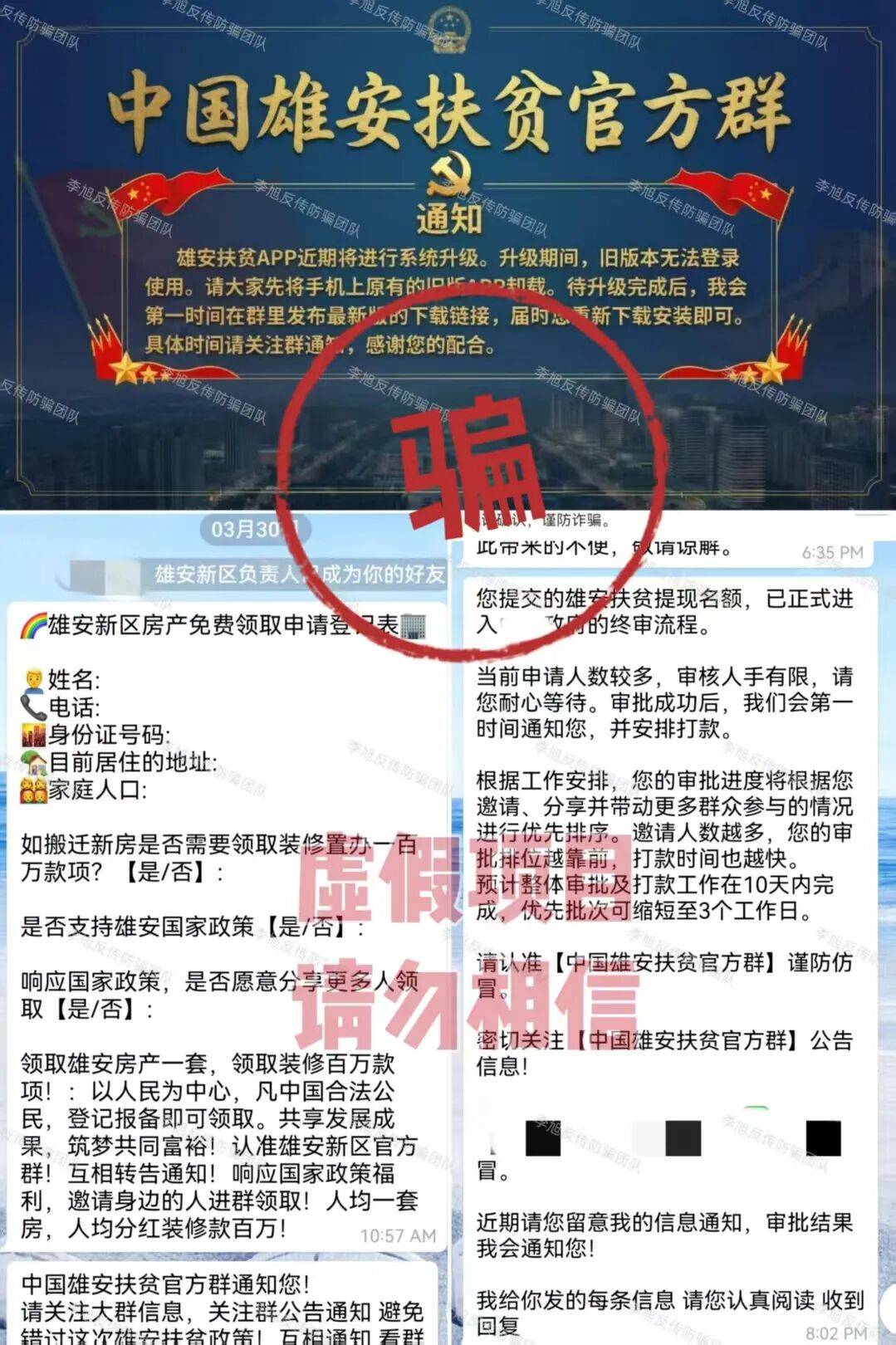 蹭“雄安新区”政策热点出现的虚假项目。打着“国家”旗号,声称参与者可免费领取巨额扶贫款和房产,以此套取用户信息。