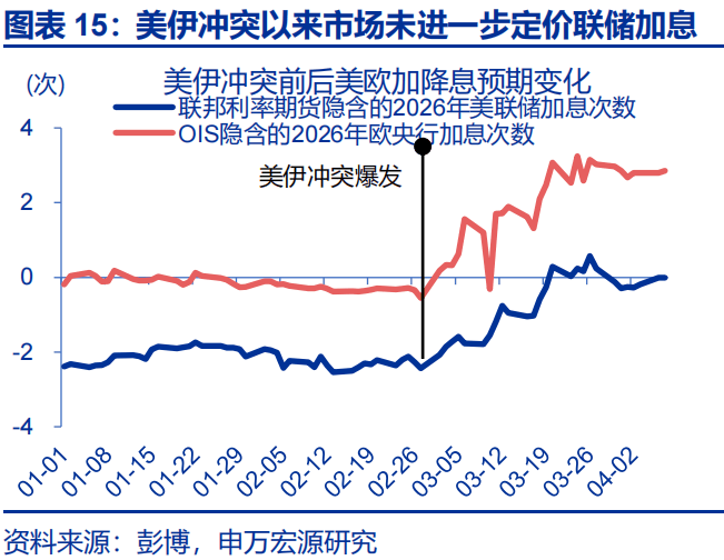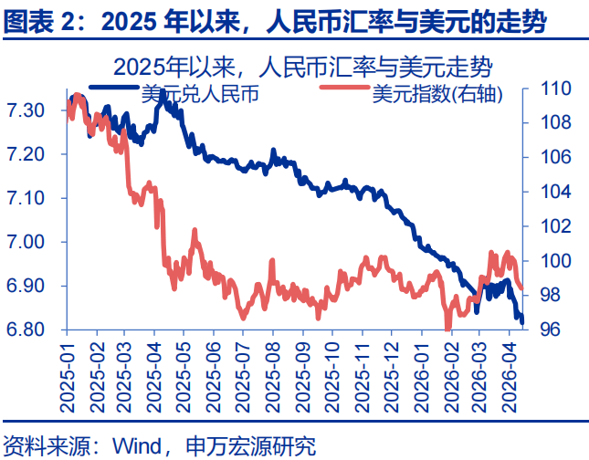 第三,本轮美元的走强也与2022年有所不同,在加息预期不强、便利性溢价回落压制下,美元反弹相对“温和”,人民币面临的外部压力不大。一方面,油价的冲击是一次性的、且对核心通胀影响较弱,这导致本轮中美联储难现2022年的“赶作业式”加息;市场在下修完年内的降息预期后、未在进一步交易美联储的加息。另一方面,特朗普政策的高度不确定性,也在频繁压制美元的便利性溢价。两者的共同作用下,中东冲突爆发以来,美元最高时仅反弹2.1%、给人民币的外部压力相对较小。