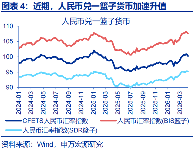 2)人民币近期“韧性”十足的原因有三:第一,基本面视角,中国经济“周期”底部在2025年三季度已然出现,而地缘扰动下我国能源结构的优势,或使我国经济在全球的相对优势进一步凸显。第二,资金面视角,“结汇潮”仍在延续,而权益市场的主动型外资也并未在避险情绪下大幅外流。第三,加息预期不强、便利性溢价回落压制下,美元反弹相对温和,使得人民币面临的外部压力不大。
