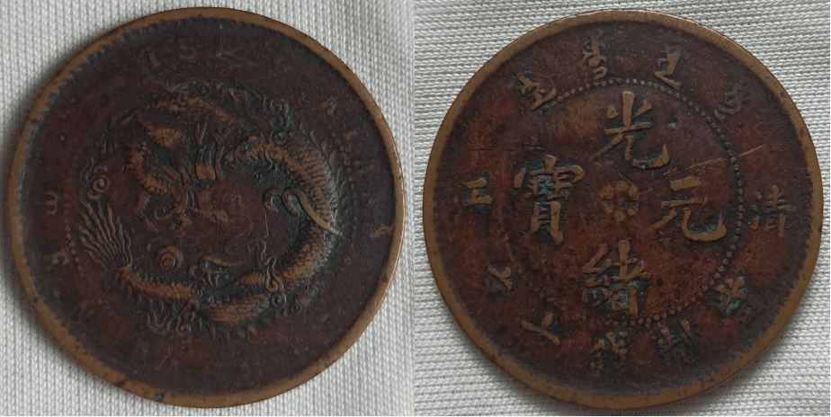 这枚清江光绪元宝当制钱十文,堪称清末铸币工艺的经典精品,品相完好、底蕴十足。其选用的铜质精良醇厚,历经百年岁月洗礼,依旧透着沉稳厚重的质感,无明显磕碰与破损。钱币正面中央,“光绪元宝”四字以端庄秀丽的楷书精心镌刻,笔画圆润流畅、刚柔并济,字里行间似有墨韵流转,尽显晚清书法的雅致风骨;四周环绕着一圈精致的珠圈,珠粒规整均匀,立体感十足;珠圈内圈左右两侧,“清江”二字清晰醒目,明确点明了这枚钱币的铸造之地,字体凝练端庄,辨识度极高;下方“当制钱十文”的字样工整规范,笔画清晰无粘连,明确标注出钱币的面值,简洁而有力量。翻转钱币,背面的景致更显匠心:一条矫健蟠龙昂首盘踞,龙身蜿蜒盘旋、姿态遒劲,龙鳞刻画细密如真、层次分明,双目炯炯有神、威严逼人,龙须飘逸舒展,仿佛下一秒便要破壁而出,尽显皇家的尊贵与威严。整枚钱币保存极为完好,表面自然形成的包浆泛着温润柔和的光泽,仿佛岁月亲手为它披上了一层柔光滤镜,每一道细微的痕迹,都是时光的无声诉说,藏着百年岁月的沧桑与温情。