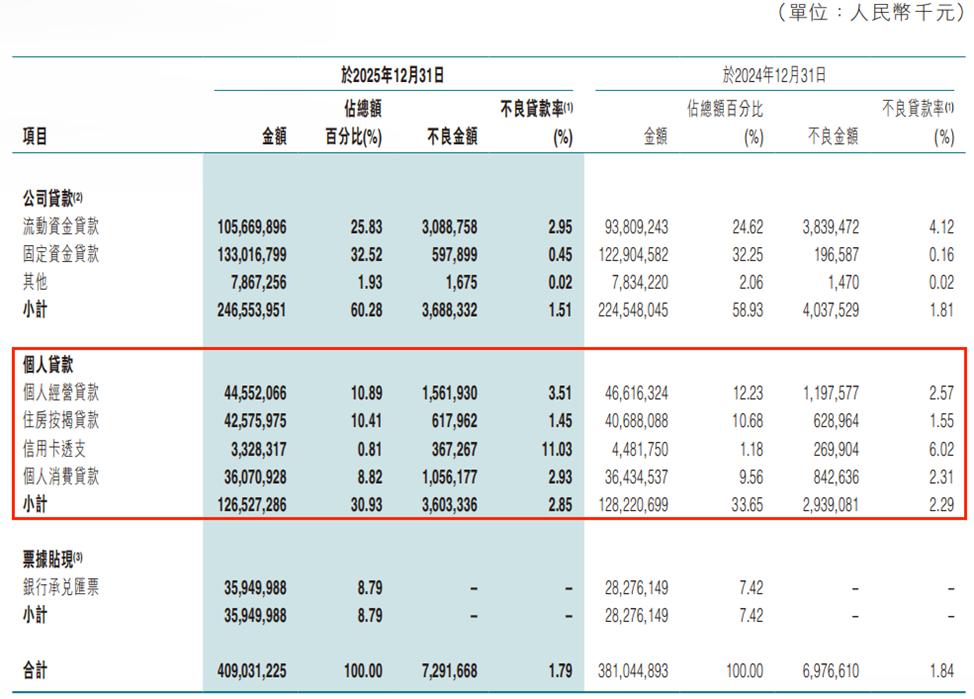 深入剖析各项指标,该行资产质量面临的结构性挑战比较严峻,核心矛盾集中于零售业务。与对公贷款不良率同比改善0.3个百分点至1.51%形成鲜明对比的是,其个人贷款不良率从2.29%大幅上行至2.85%,一年时间增长了0.56个百分点。其中,个人经营贷与消费贷不良率分别升至3.51%和2.93%,显示面向小微企业与个人的信贷风险正在全面暴露。
