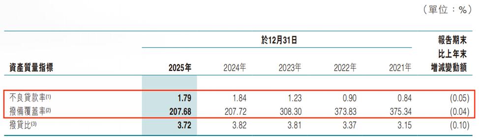 然而,这一整体数据的背后,是风险在业务板块间的剧烈转移与积聚。拨备覆盖率持续走低至207.68%,较2021年的峰值已下降超过167个百分点,风险抵补能力减弱;资本充足率与核心一级资本充足率亦分别降至15.41%和13.30%,资本持续消耗中,未来业务增长空间受到制约。
