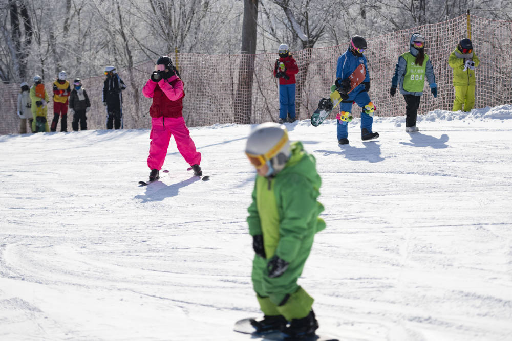 ↑1月15日,单宝源(左六)在亚布力滑雪场为游客拍照。出生于黑龙江绥芬河的“00后”单宝源是亚布力滑雪场的兼职滑雪摄影师。新华社记者 谢剑飞 摄