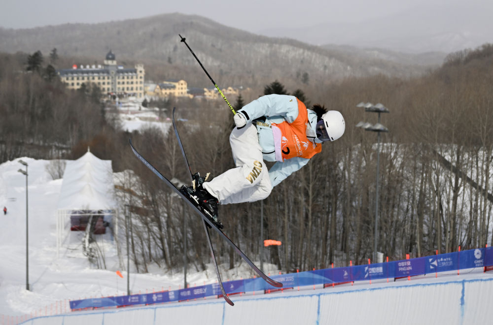 ↑2月12日,中国选手杨如意在第九届亚冬会自由式滑雪女子大跳台决赛中。最终,她获得季军。新华社记者 王松 摄