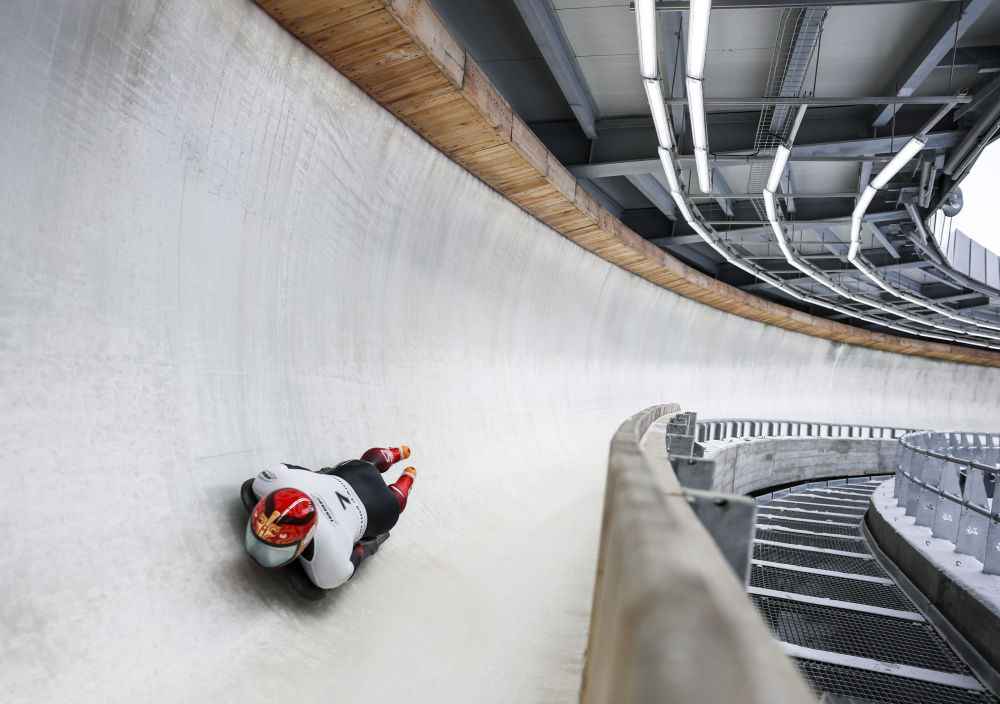 ↑11月21日,中国选手殷正在国际雪车联合会世界杯系列赛科尔蒂纳丹佩佐站钢架雪车男子个人赛中获得季军。新华社记者 李京 摄