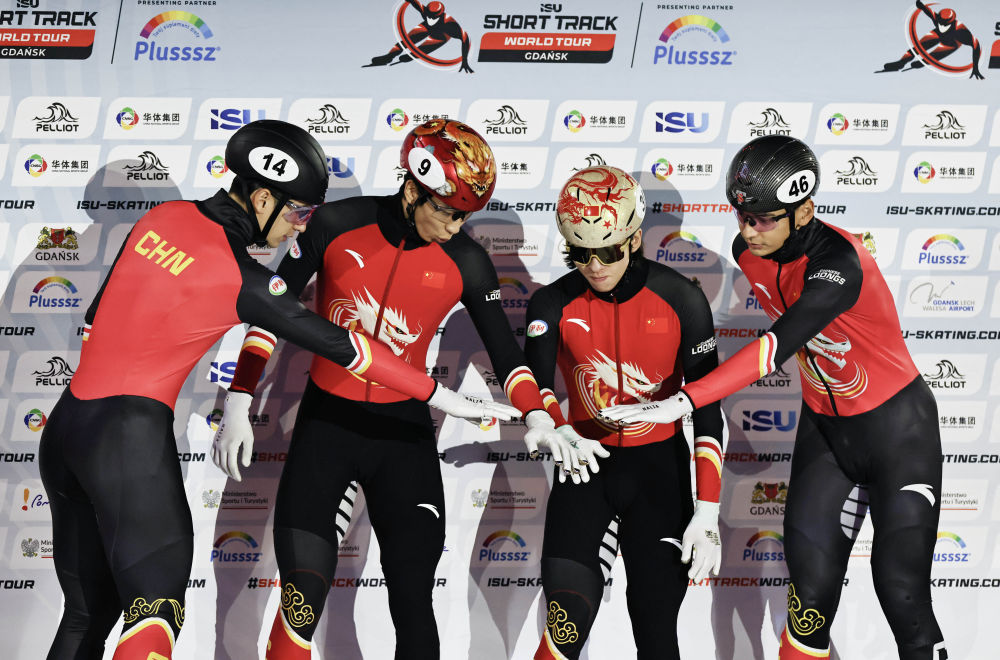 ↑11月23日,中国队选手刘少昂、孙龙、林孝埈、刘少林(从左到右)在波兰格但斯克举行的2025-2026赛季国际滑联短道速滑世界巡回赛暨米兰冬奥会资格赛第三站男子5000米A组决赛前互相鼓励。最终,中国队获得亚军。新华社记者 高静 摄